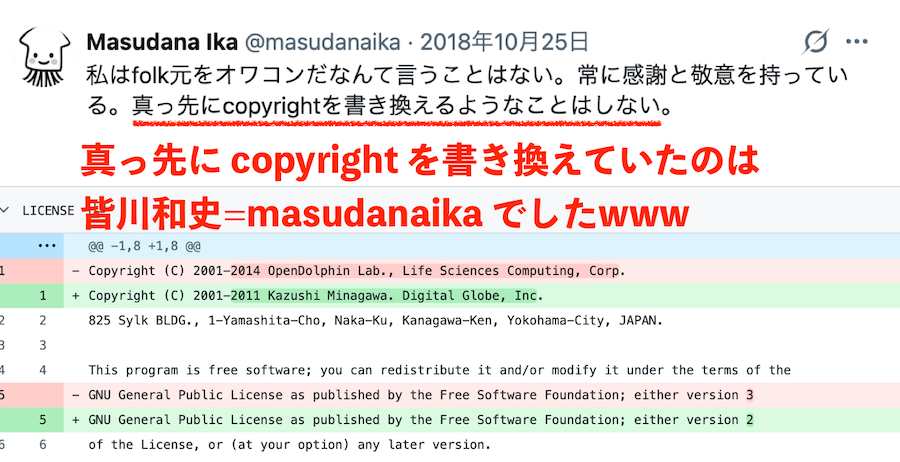 次に、皆川和史の LICENSE 文書改竄が明らかになるにつれ、『masudanaika = 皆川和史』説が囁かれるようになった。